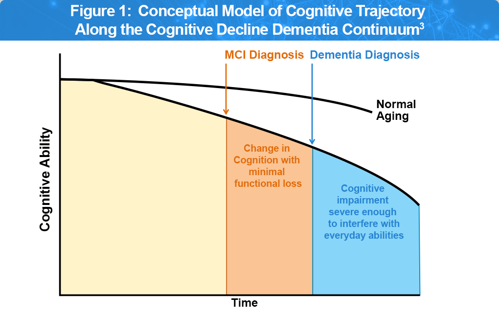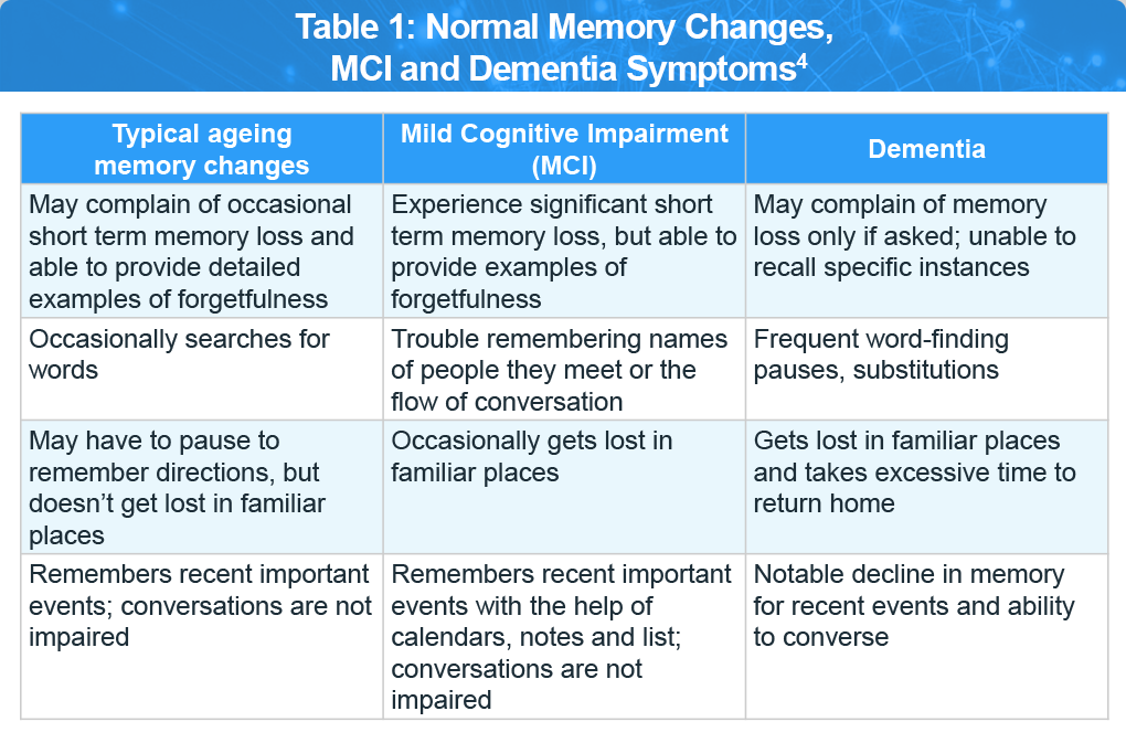 Making the distinction between MCI and normal aging can be a challenge for clinicians.1,2 While subtle forgetfulness, such as misplacing objects and having difficulty recalling words, can be difficult for individuals as they age, it probably represents normal aging. The memory loss that occurs in those with MCI is more prominent.2 Figure 1 illustrates the cognitive trajectory. The shift away from typical aging is marked by cognitive decline that exceeds what is normally expected in older adults (green zone). A diagnosis of MCI may be considered when there is noticeable cognitive change accompanied by little to no impact on daily functioning (orange zone). If the condition progresses, a dementia diagnosis may be made when cognitive deficits become severe enough to significantly disrupt everyday activities (blue zone).3 Table 1 lists few distinguishing features between cognitive normal memory changes, MCI and dementia symptoms.4
