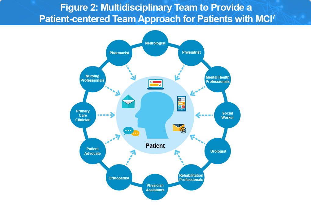 Individuals identified with MCI should receive timely, comprehensive evaluations and appropriate guidance for next steps. A brief cognitive assessment can be conducted during a routine primary care visit or scheduled as a separate appointment. This assessment may be self-administered or conducted by trained healthcare staff, such as a nurse or medical technician.5 For more in-depth evaluation, multidisciplinary teams can offer neuropsychological testing, imaging, and coordinated care planning to provide a patient-centered team approach which promotes communication and optimal care (Figure 2).5,7