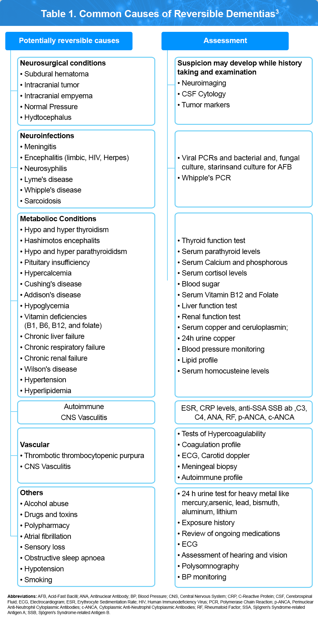 Additionally, it is Important to rule out potential reversible causes of cognitive decline. Reversible dementias refer to conditions that cause cognitive or behavioral symptoms, which may improve or fully resolve when the underlying cause is properly treated. Numerous potential factors have been identified that can lead to temporary neurocognitive impairment in older adults (see Table 1). However, the term “reversible dementia” can be misleading, as many metabolic causes that affect cognition also share features with delirium, leading to diagnostic overlap.2